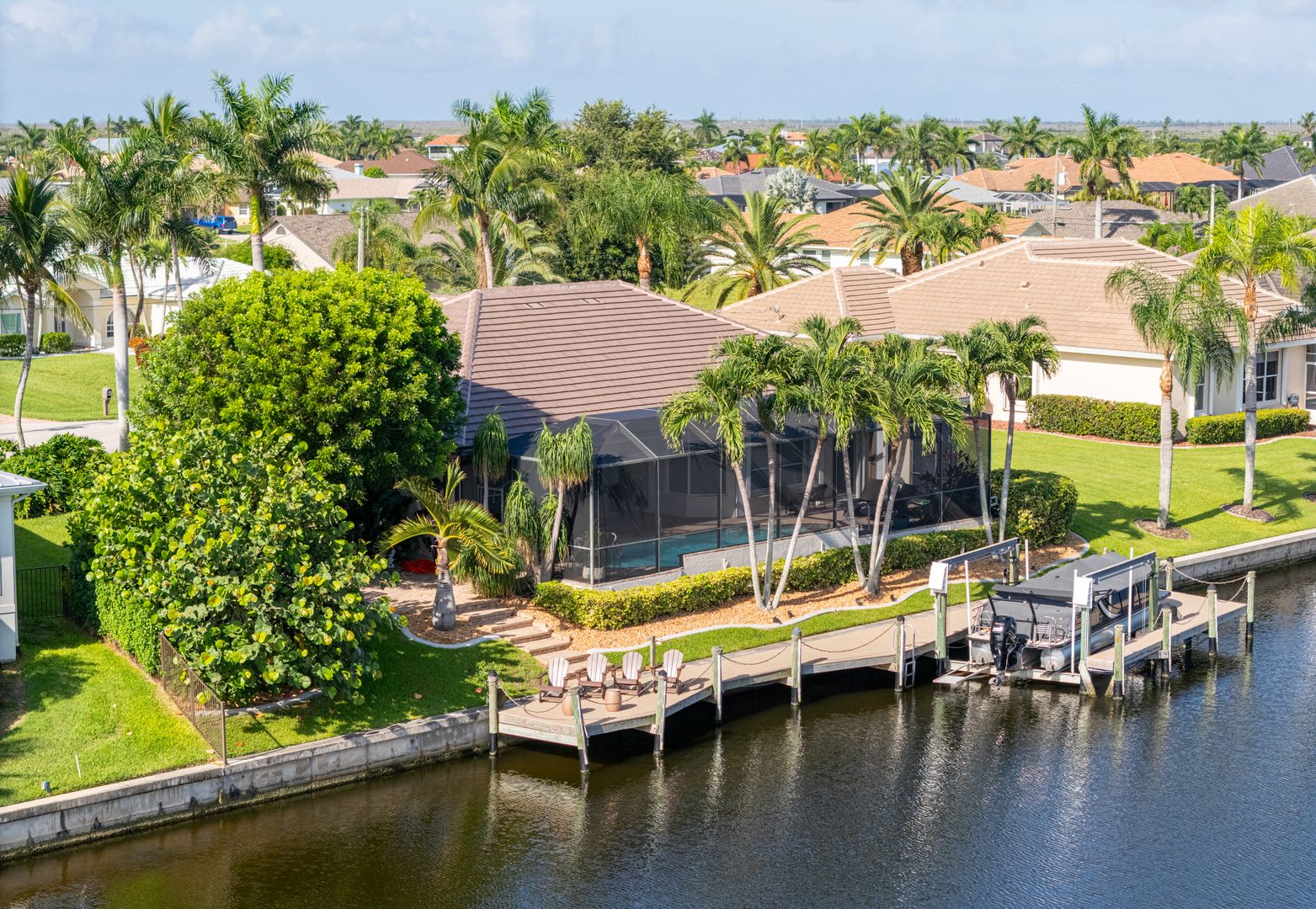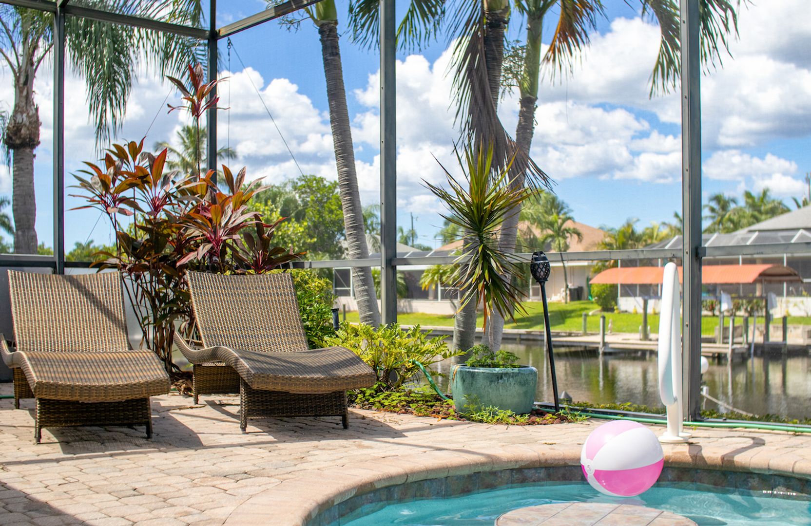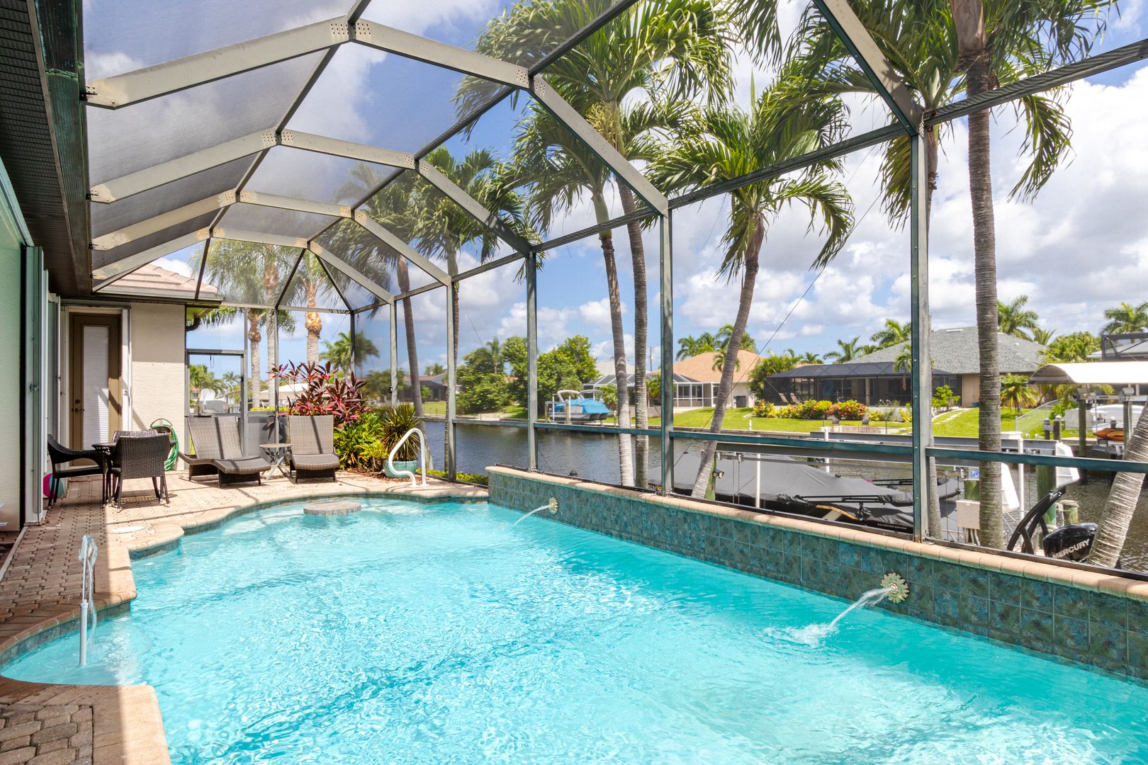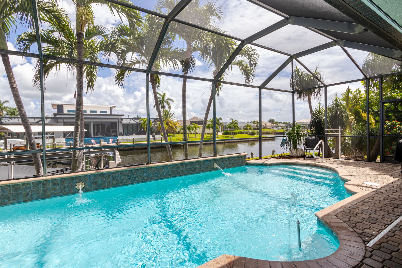 Welcome to Seabird Villa. This VACATION/SEASONAL/SHORT TERM RENTAL is in beautiful Southwest Cape Coral with an intersecting canal view! Weekly rentals are permitted in this open concept 3 bedroom, plus a den, 3 bath home. It easily accommodates up to 10 people. Very family friendly; one bedroom has two sets of bunk beds! The heated pool with martini table and outdoor TV is sure to keep the family cooled off and entertained throughout your stay. Nicely appointed and beautifully landscaped, this is the get-away home you have been looking for. Close to everything that Cape Coral and Southwest Florida have to offer. Great beaches, restaurants, bars, golf courses & attractions are all nearby. It’s All About the Lifestyle!