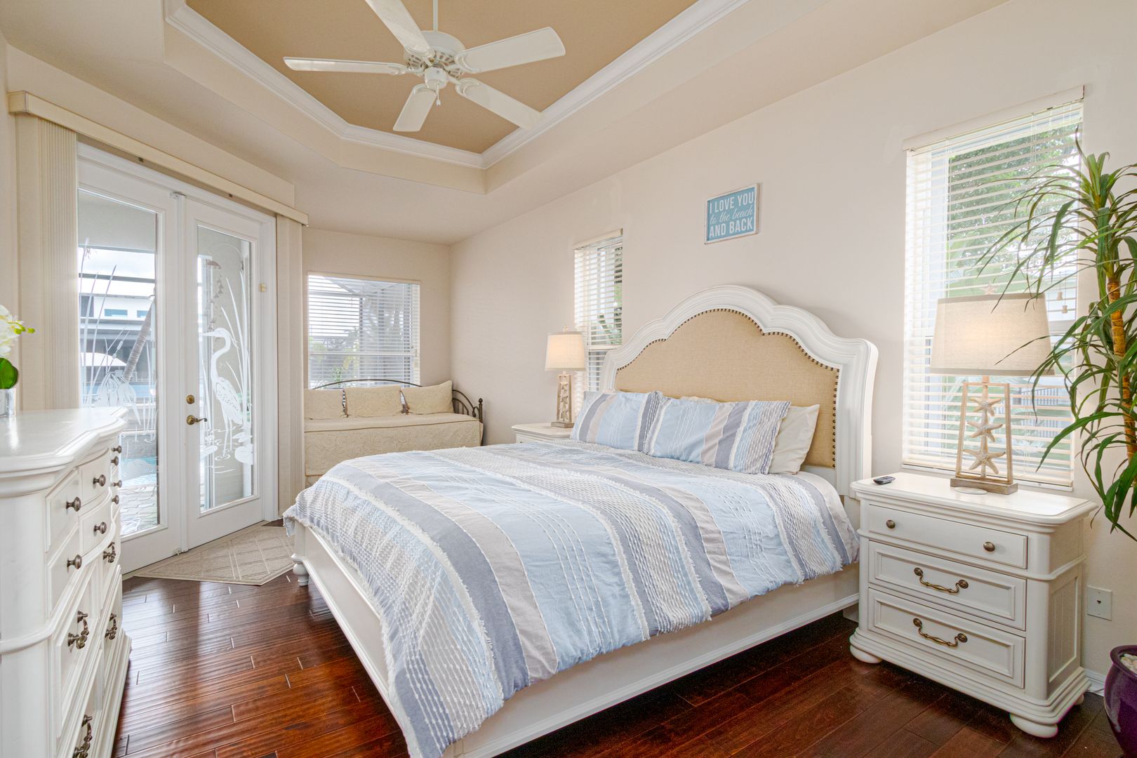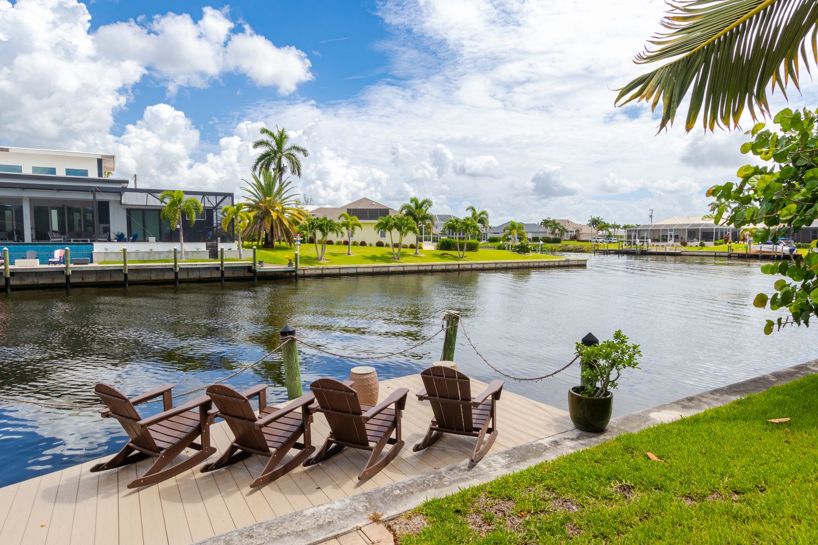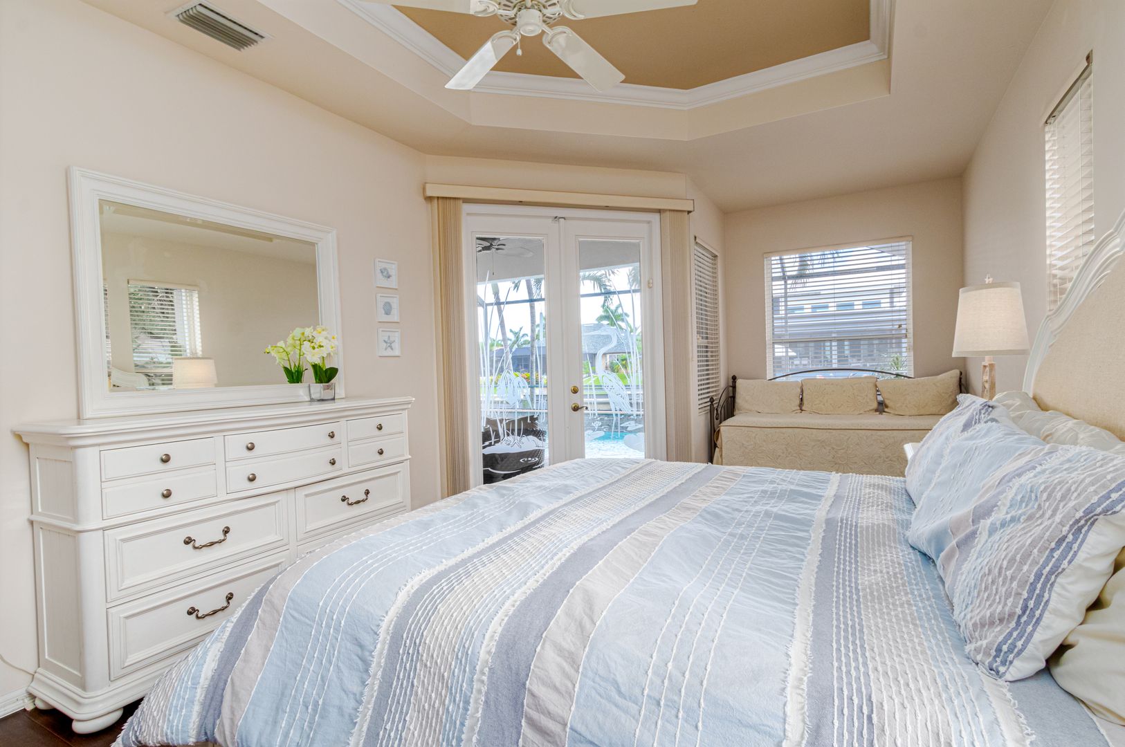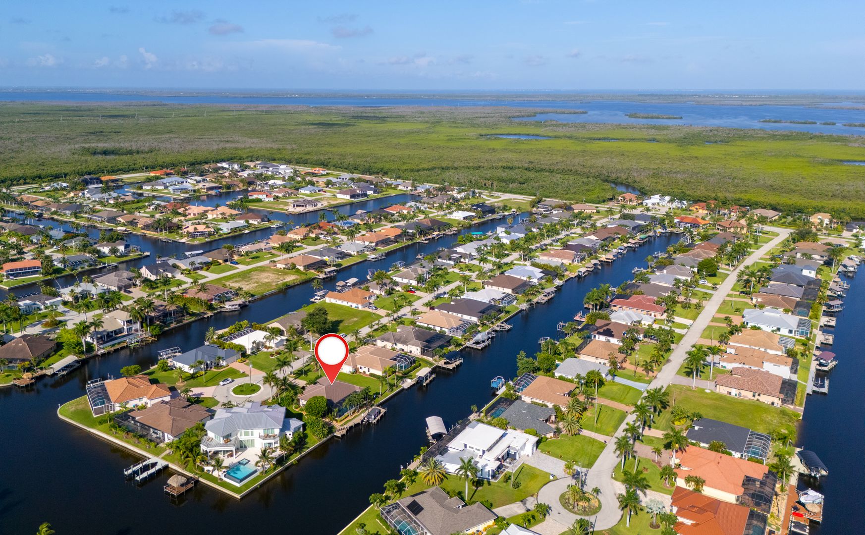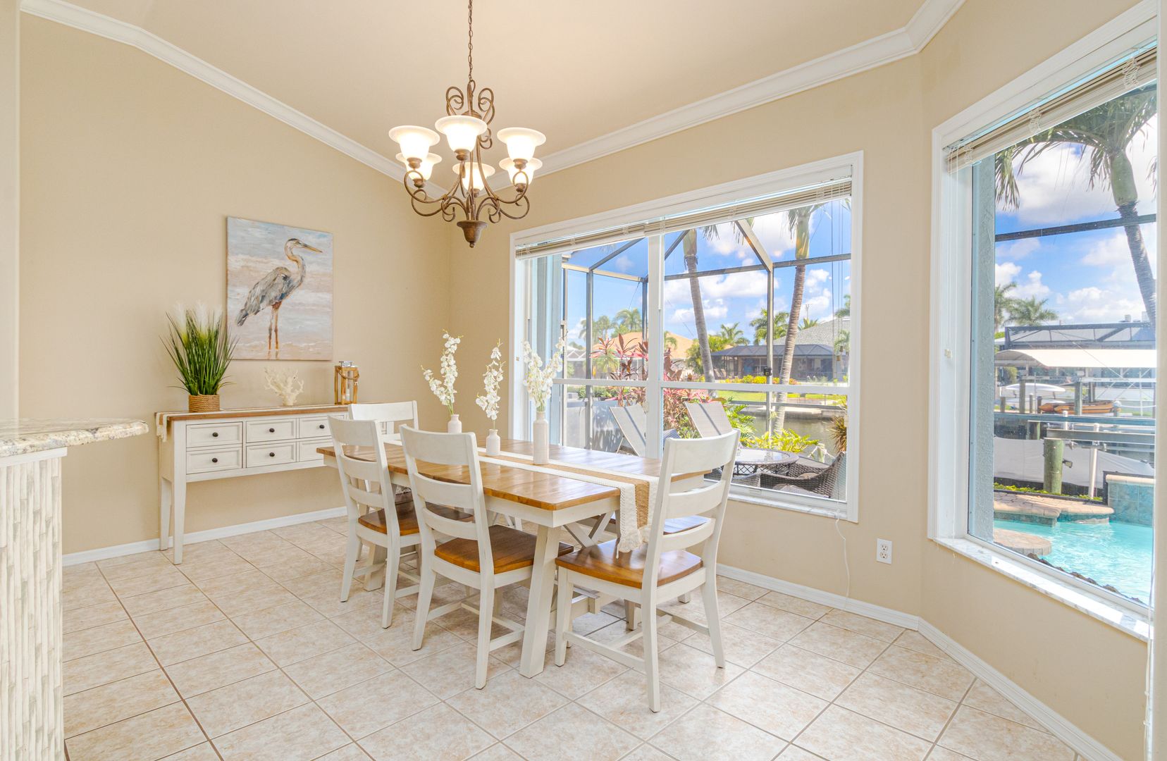 Welcome to Seabird Villa. This VACATION/SEASONAL/SHORT TERM RENTAL is in beautiful Southwest Cape Coral with an intersecting canal view! Weekly rentals are permitted in this open concept 3 bedroom, plus a den, 3 bath home. It easily accommodates up to 10 people. Very family friendly; one bedroom has two sets of bunk beds! The heated pool with martini table and outdoor TV is sure to keep the family cooled off and entertained throughout your stay. Nicely appointed and beautifully landscaped, this is the get-away home you have been looking for. Close to everything that Cape Coral and Southwest Florida have to offer. Great beaches, restaurants, bars, golf courses & attractions are all nearby. It’s All About the Lifestyle!