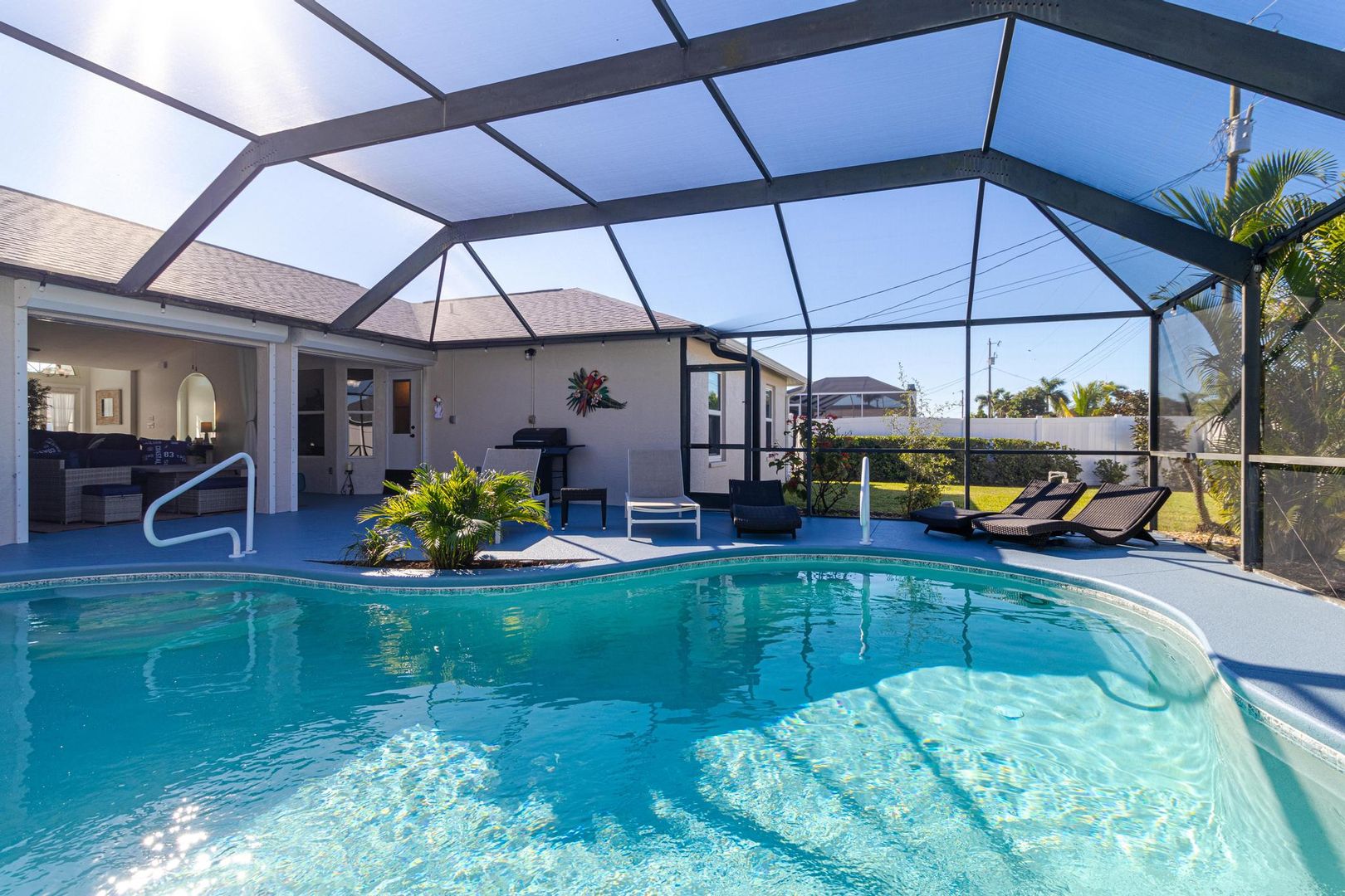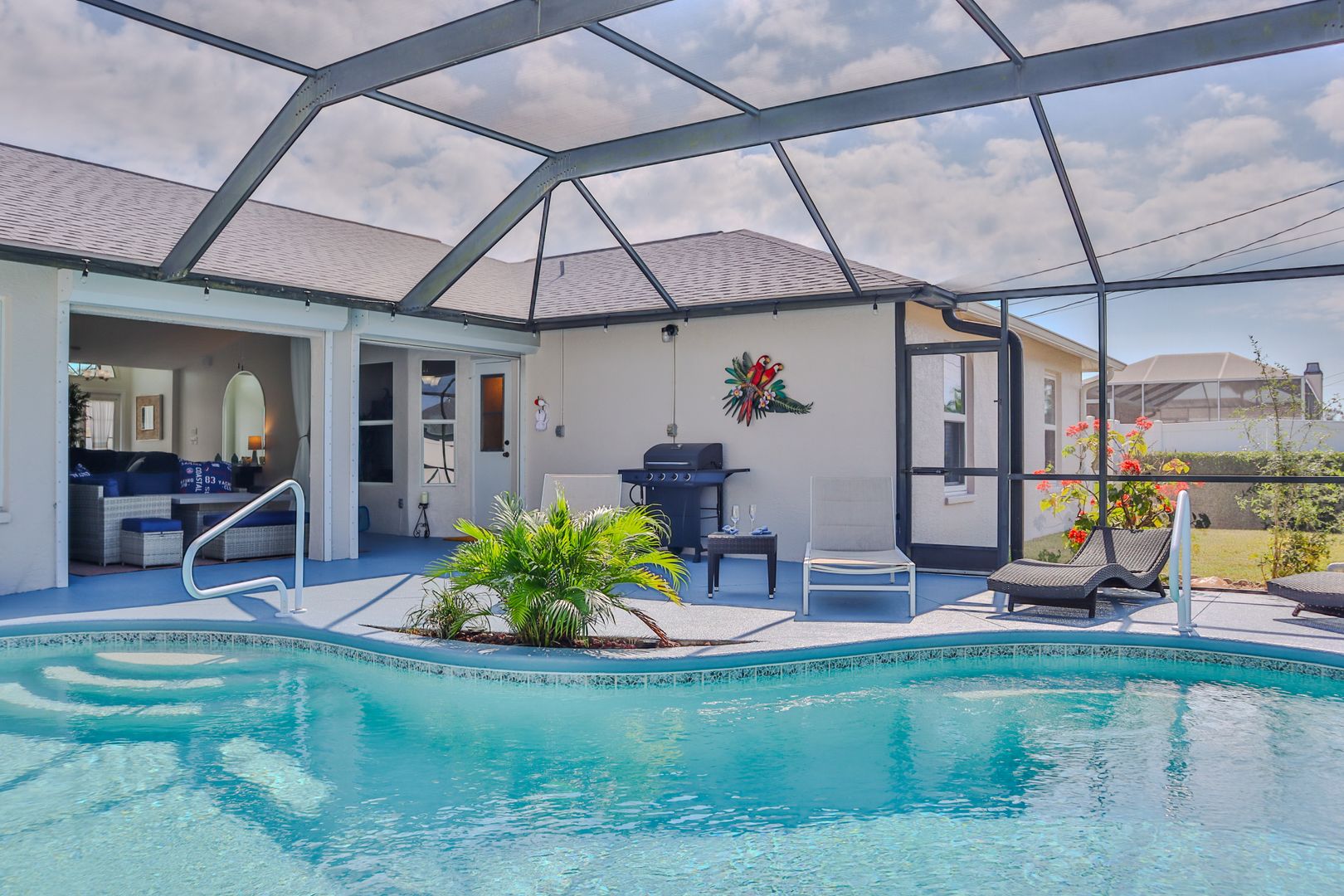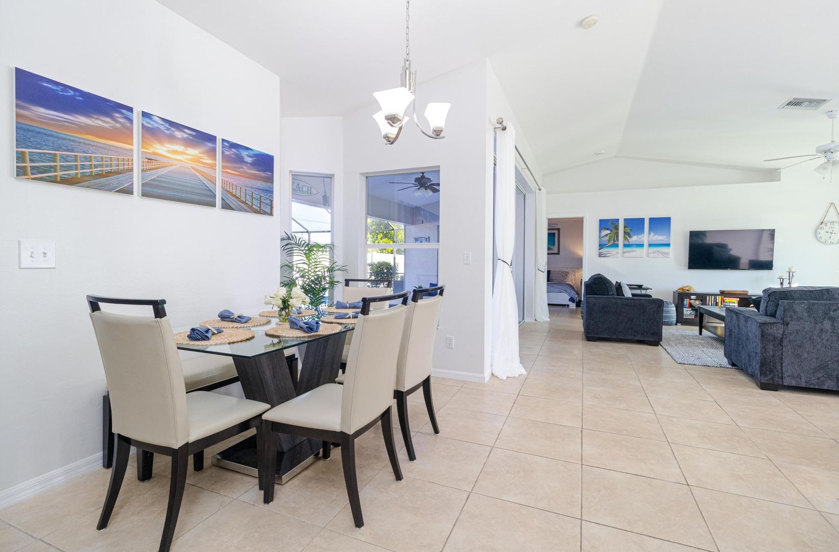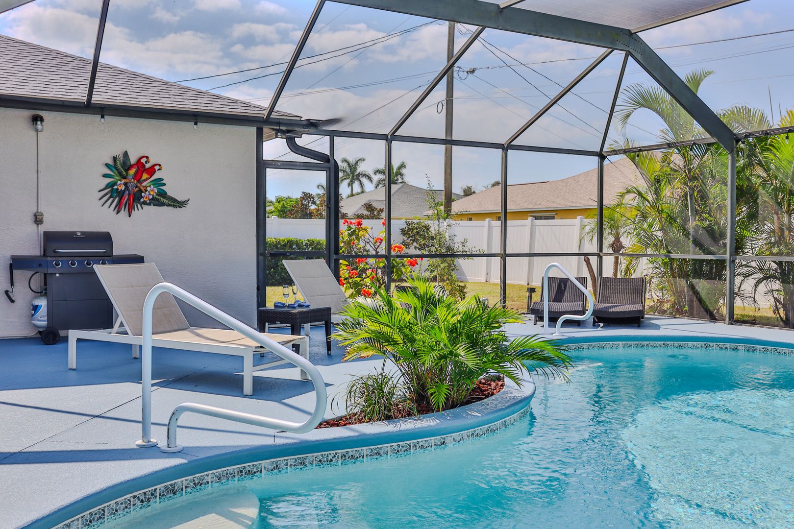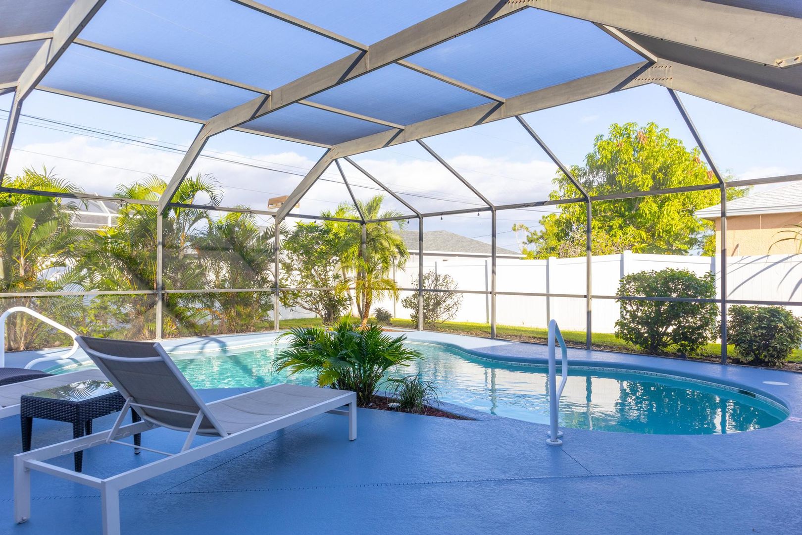 Welcome to our exquisite 3-bedroom, 2-bathroom vacation rental home in South West Cape Coral, FL. This beautifully decorated house features a pool and is equipped with everything you need for a perfect vacation, including games, books, and pool toys. The open-concept living space is bathed in natural light, and the fully-equipped kitchen is ideal for preparing meals. The backyard oasis with a screened lanai and sparkling pool is perfect for relaxation. Located in a peaceful neighborhood, this vacation rental offers a delightful and comfortable escape for your getaway.