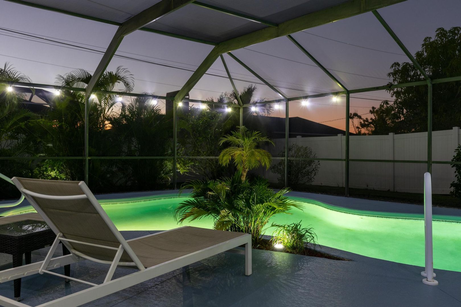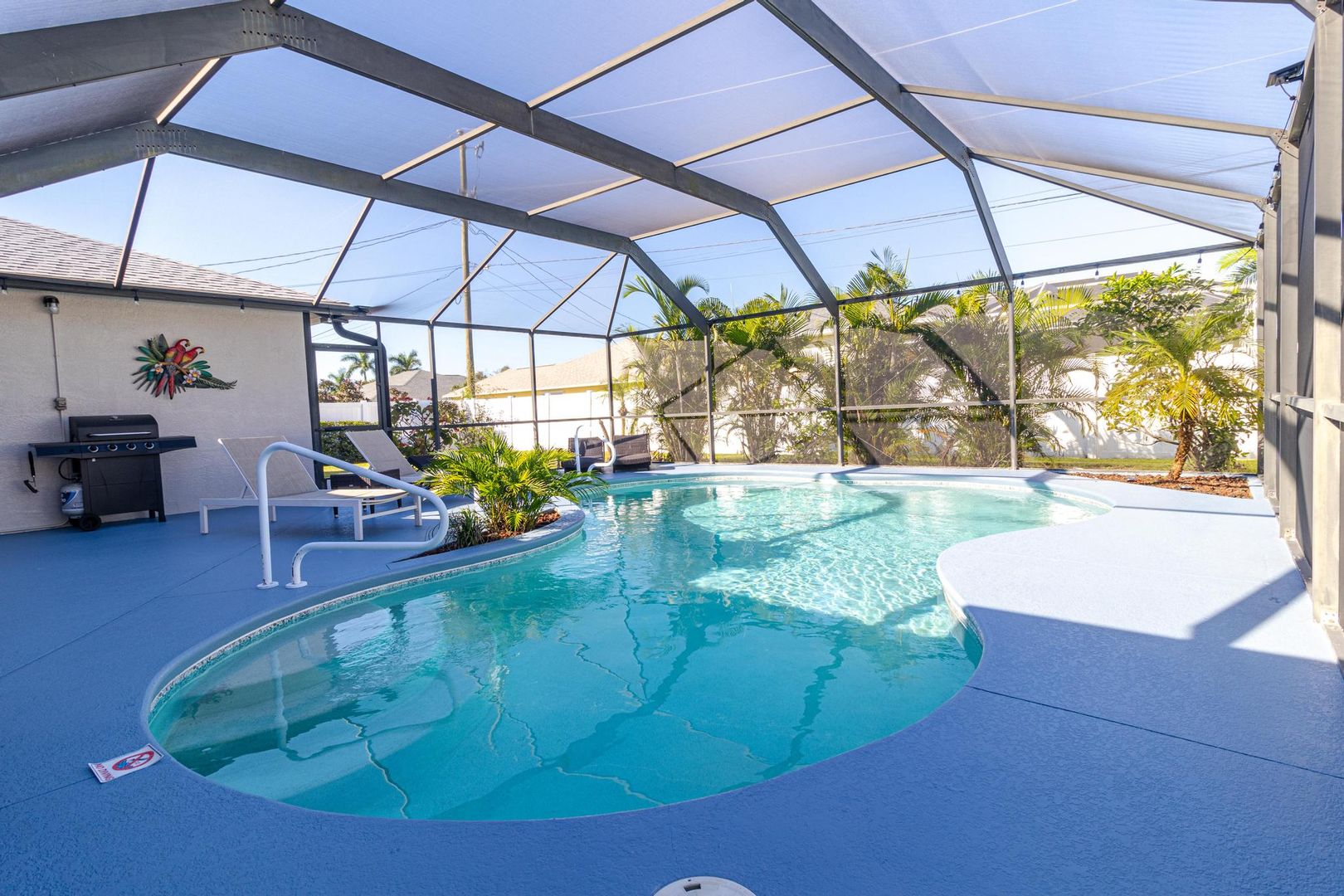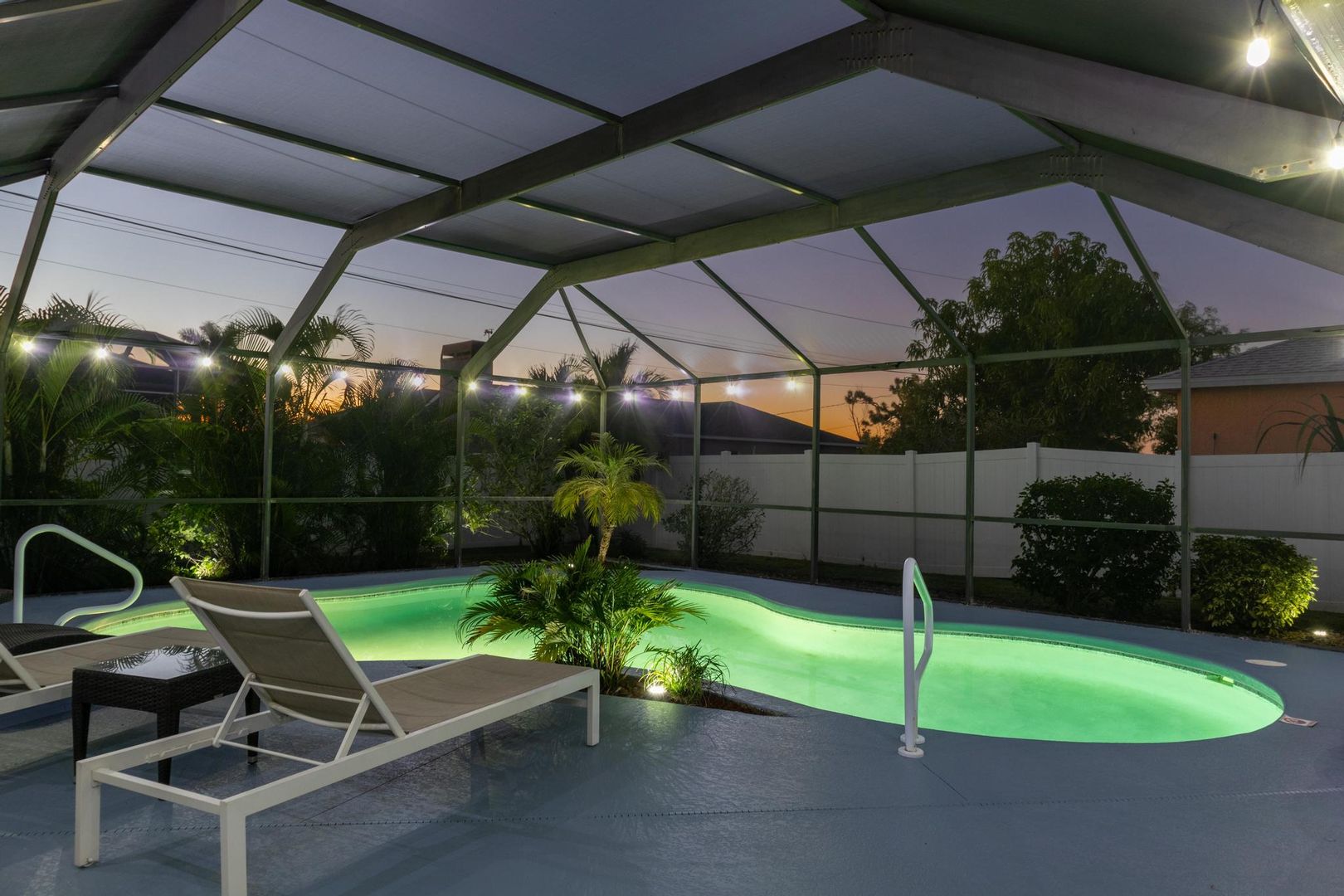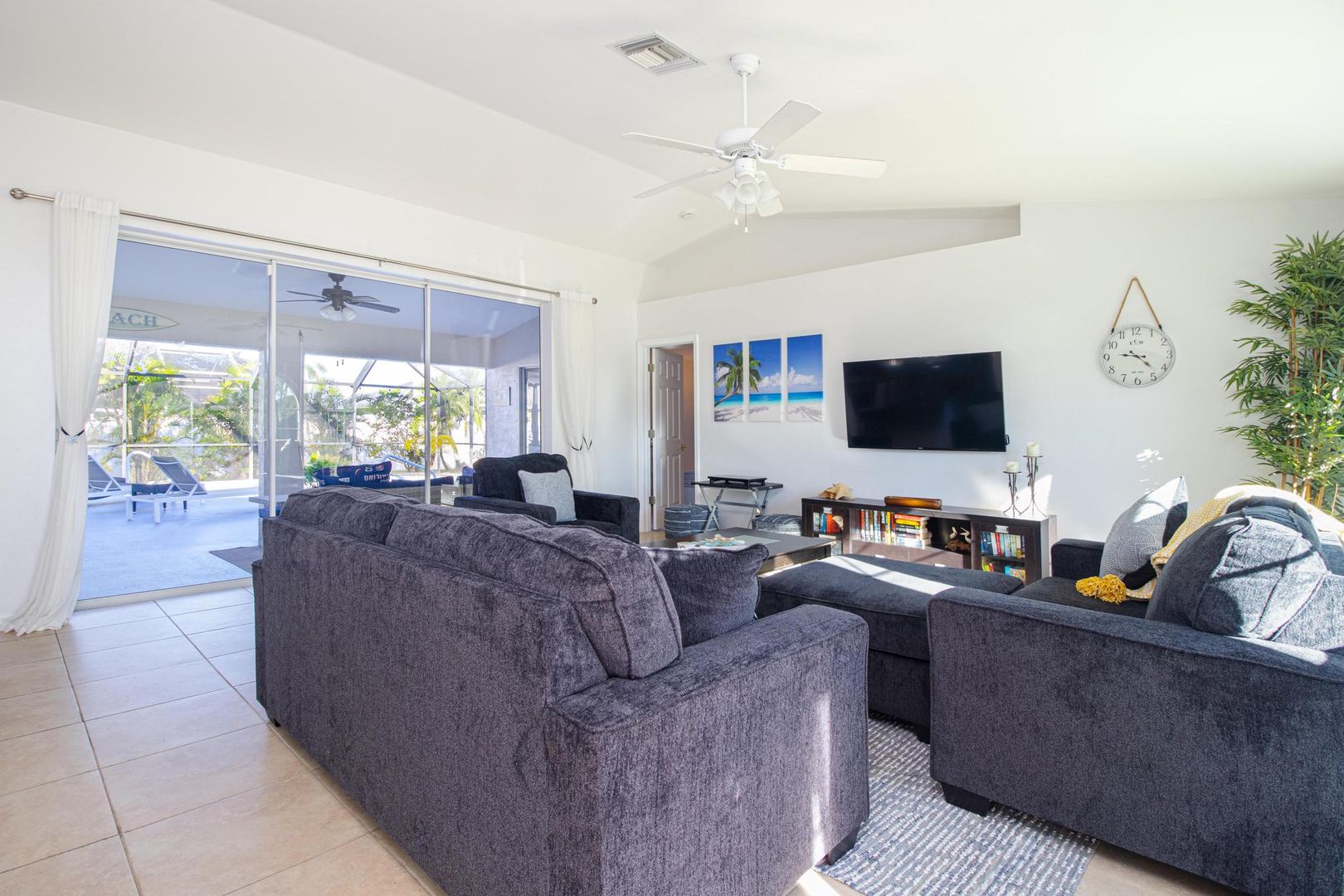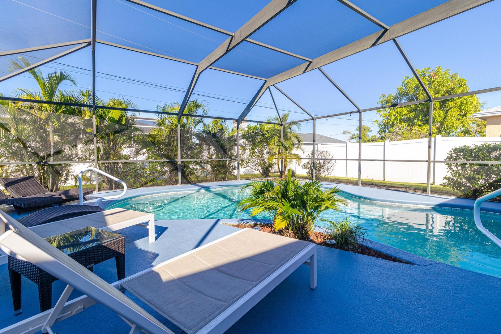 Welcome to our exquisite 3-bedroom, 2-bathroom vacation rental home in South West Cape Coral, FL. This beautifully decorated house features a pool and is equipped with everything you need for a perfect vacation, including games, books, and pool toys. The open-concept living space is bathed in natural light, and the fully-equipped kitchen is ideal for preparing meals. The backyard oasis with a screened lanai and sparkling pool is perfect for relaxation. Located in a peaceful neighborhood, this vacation rental offers a delightful and comfortable escape for your getaway.