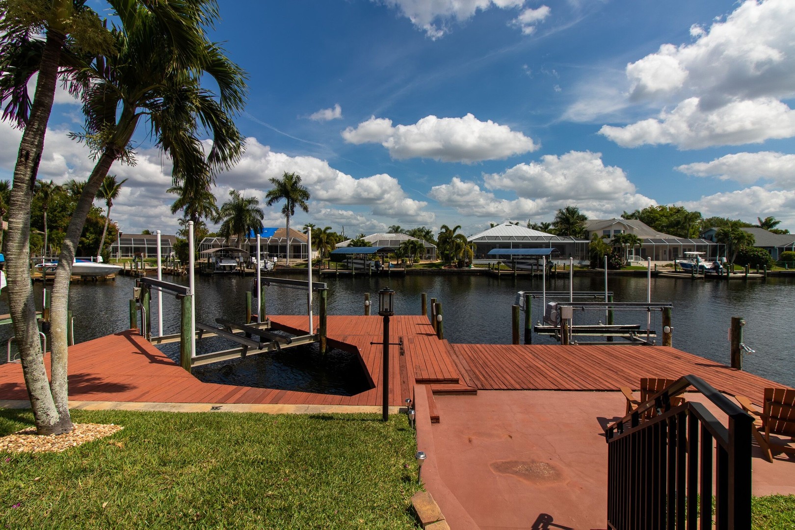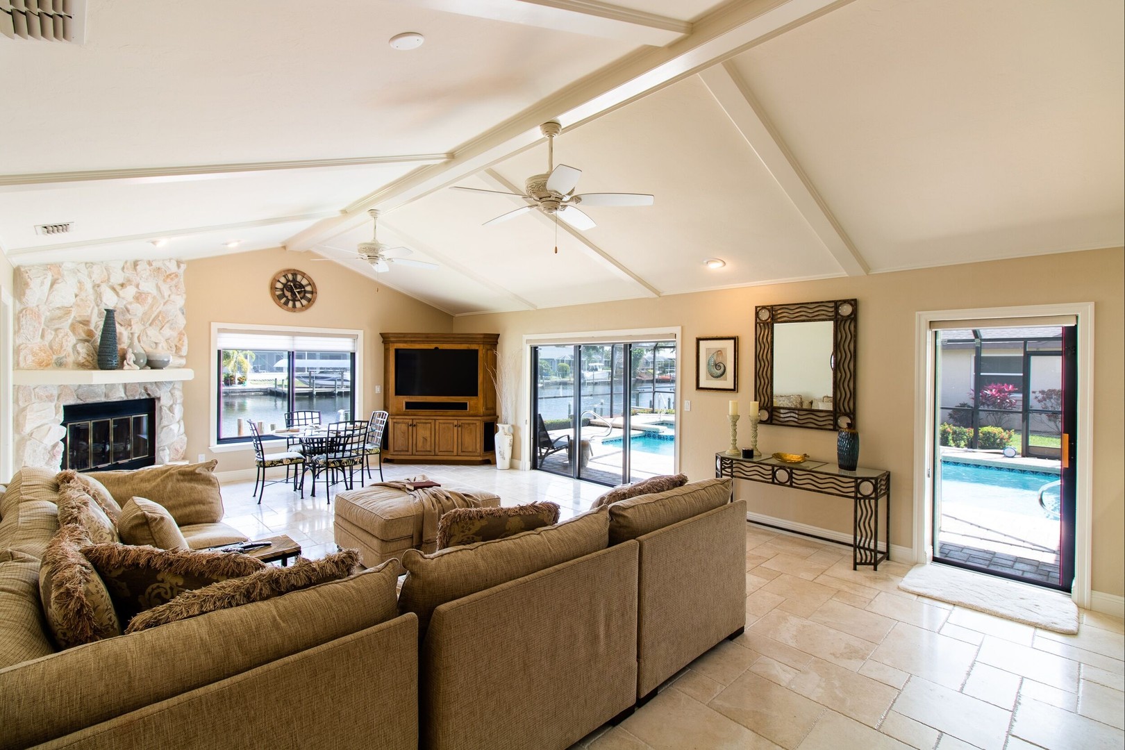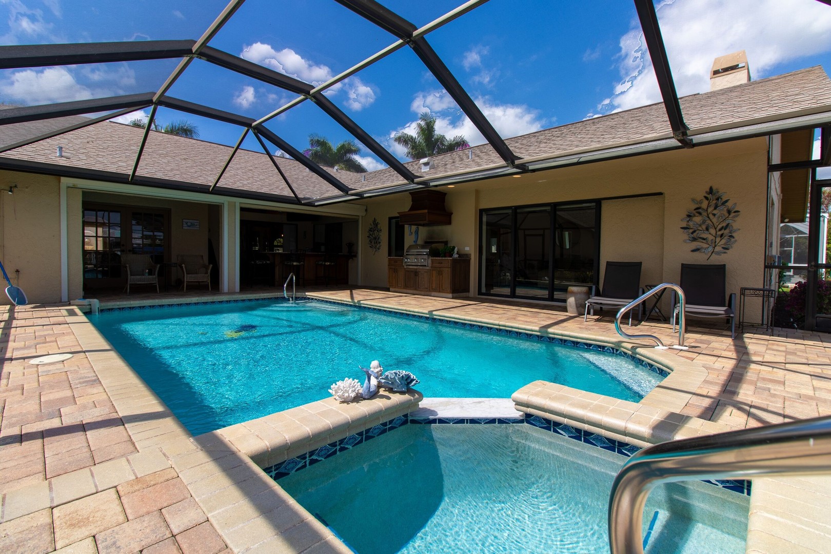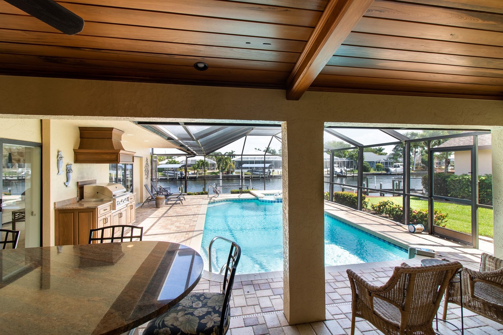 This Gulf-access 4 bedroom, 3.5 bath pool home is located in the desirable Rose Garden area of Cape Coral and is situated on a beautifully landscaped lot overlooking a wide canal. For the serious boater, you are only an 8 minute ride to the Caloosahatchee River and there is fish cleaning station on the dock! Witness beautiful sun rises each morning and great fish watching. Spacious living area with a custom designed kitchen sure to please any gourmet cook. Home has recently been completely updated and features chiseled marble floors throughout, granite tops, Hunter Douglas window treatments, and updated bathrooms. The huge family room features a stone fireplace, pocket sliders opening up to the beautiful pool and spa area with a custom outdoor bar and grill. It just doesn’t get any better than this! Contact us today to book your stay in paradise!