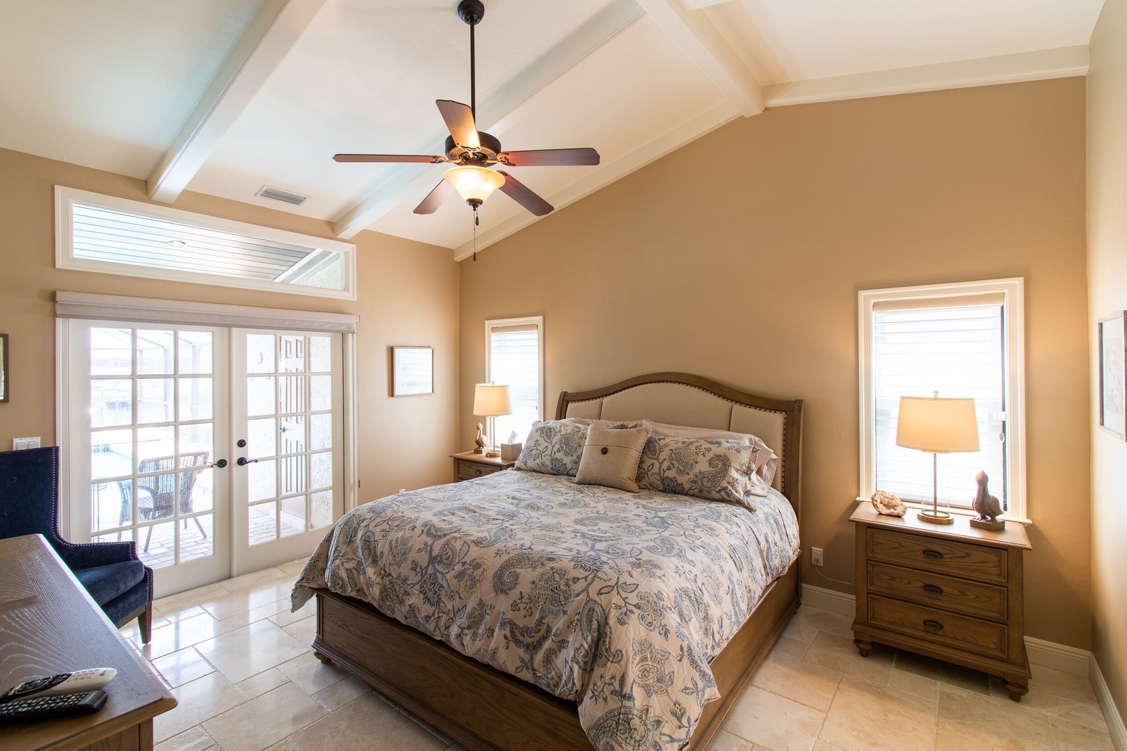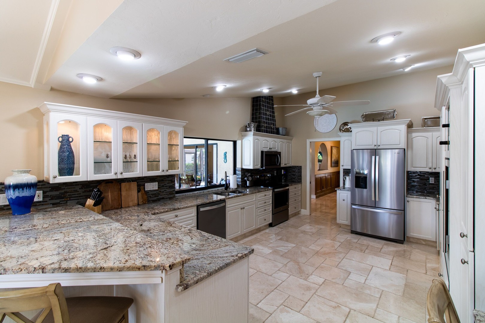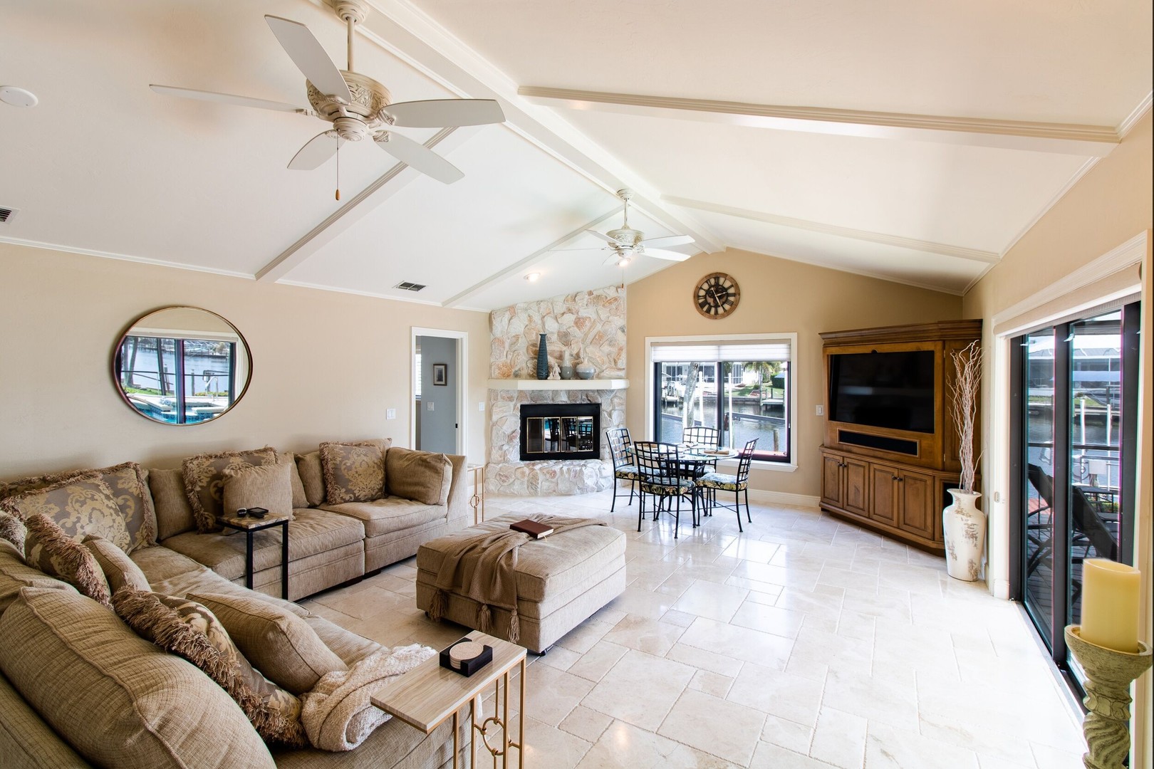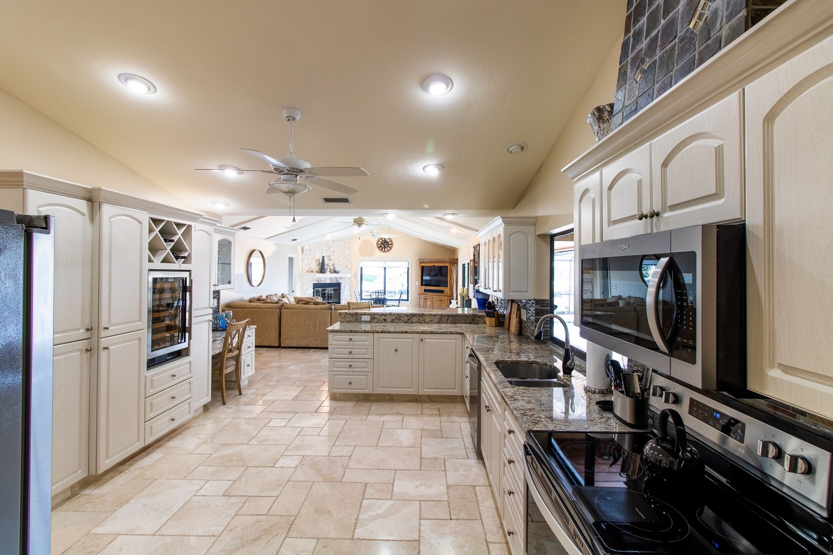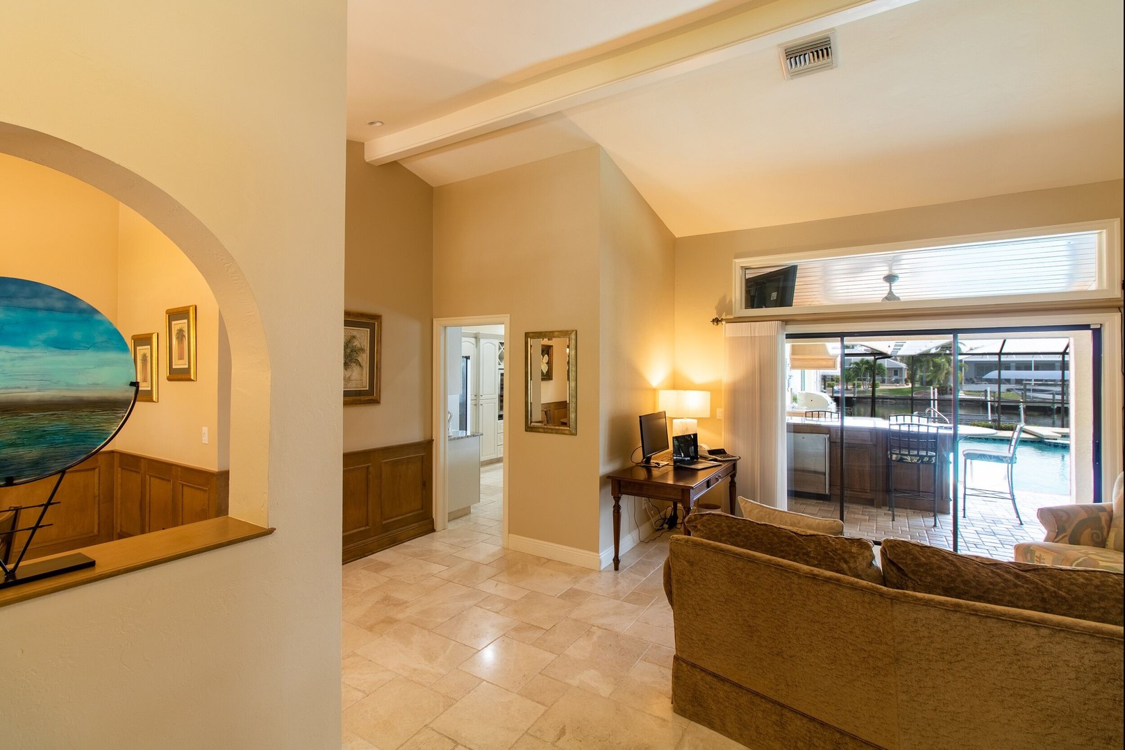 This Gulf-access 4 bedroom, 3.5 bath pool home is located in the desirable Rose Garden area of Cape Coral and is situated on a beautifully landscaped lot overlooking a wide canal. For the serious boater, you are only an 8 minute ride to the Caloosahatchee River and there is fish cleaning station on the dock! Witness beautiful sun rises each morning and great fish watching. Spacious living area with a custom designed kitchen sure to please any gourmet cook. Home has recently been completely updated and features chiseled marble floors throughout, granite tops, Hunter Douglas window treatments, and updated bathrooms. The huge family room features a stone fireplace, pocket sliders opening up to the beautiful pool and spa area with a custom outdoor bar and grill. It just doesn’t get any better than this! Contact us today to book your stay in paradise!