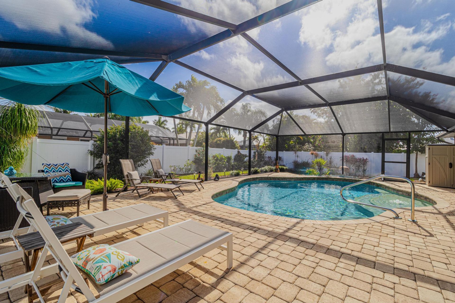 Ready to jump in? This meticulously maintained home in Southwest Cape Coral has an outdoor living environment complete with a heated saltwater pool and paver deck waiting for you. The 3 bedroom and 2 bathroom home is beautifully landscaped with a privacy fence in the backyard. Newer roof (2018) and A/C (2017) this gem weathered Hurricane Ian and sustained minimal damage. Storm protected by impact windows and Kevlar. Located close to Cape Harbour, Tarpon Pointe Marina and Downtown Cape Coral you are minutes away from shopping, great dining and waterfront entertainment.
